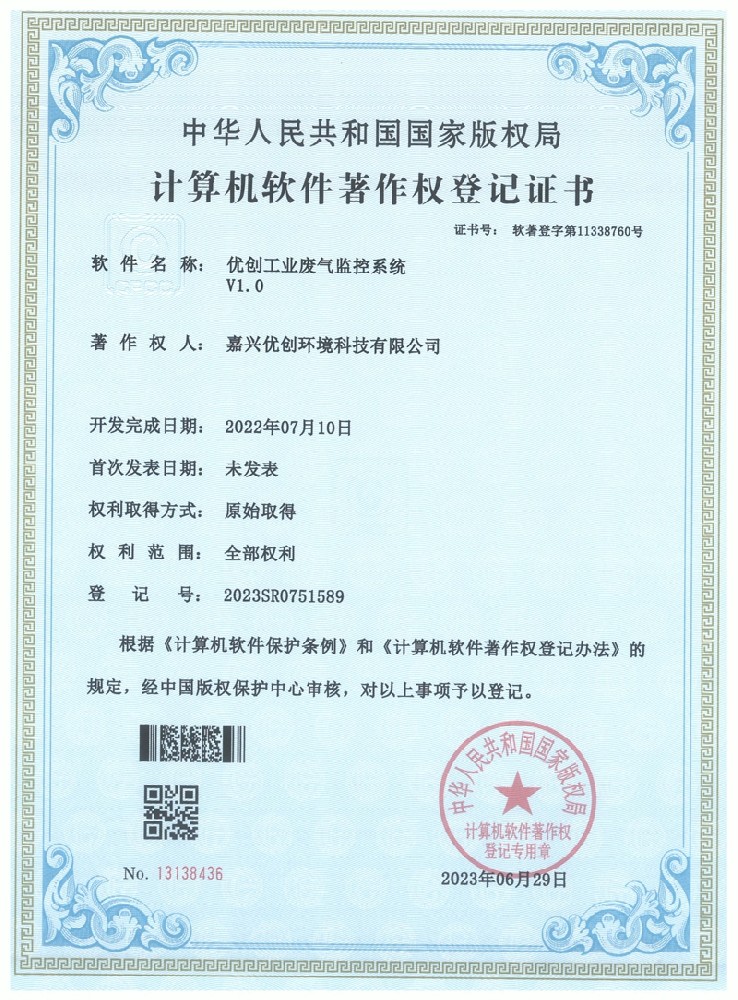 工业废气监控系统著作权登记证书